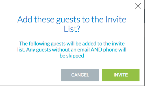After you click the "Add Guests to Invite List" button, you will see this message window. To confirm, click the INVITE button to send a text/email invite to the guests that have been selected. Note: If a guest does not have a phone number or email they will not be able to be moved to the invite list.