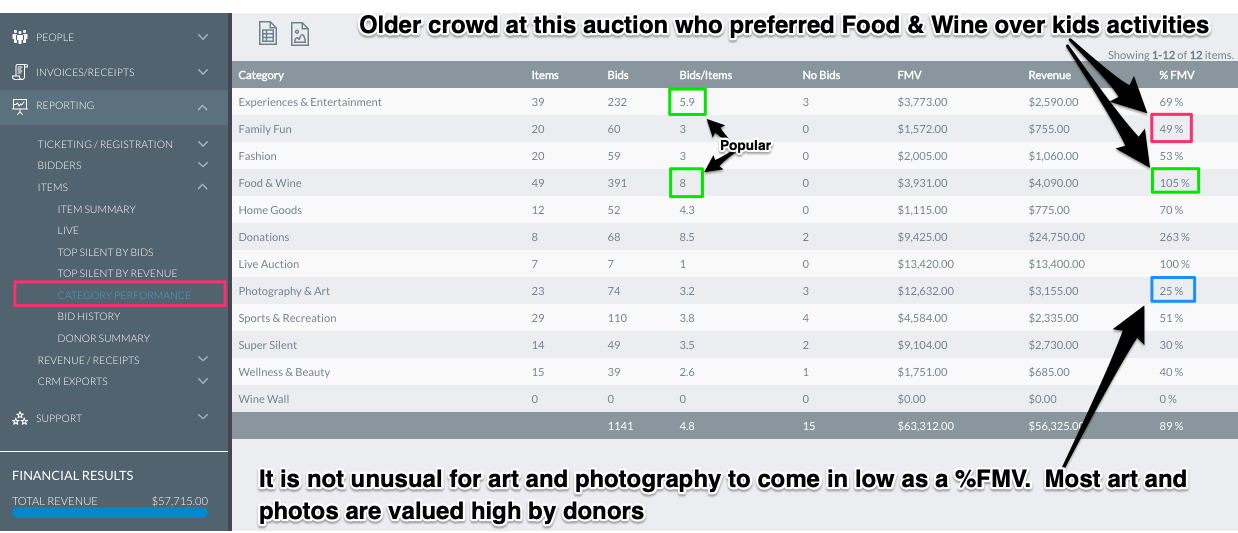 - As a % of FMV, it is also evident that both of these categories did well. In fact, Food and Wine generated 105% of FMV (which is great for a silent auction). Similarly, you can see that Family Fun did not perform as well in this area.